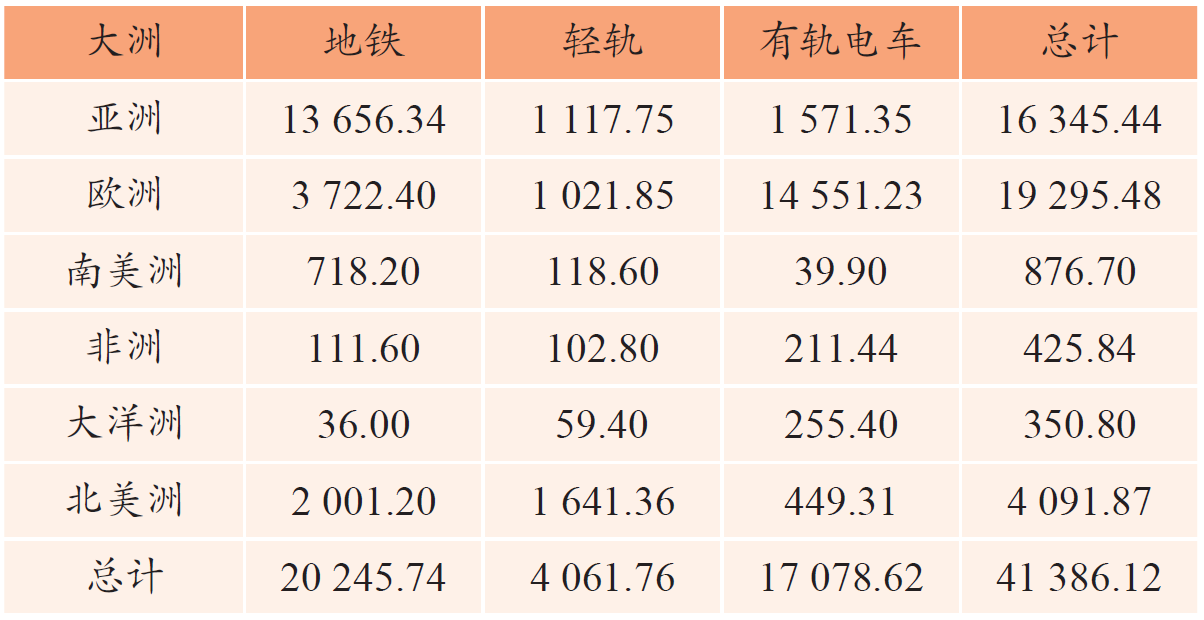 La Figura 1 muestra la escala general del tránsito ferroviario urbano en los principales continentes del mundo (Nota: todas las ciudades de Rusia están clasificadas en Europa para el cálculo). Los datos indican que el metro y los tranvías son los principales tipos de transporte ferroviario urbano a nivel mundial, y el tránsito ferroviario urbano mundial se concentra principalmente en Eurasia, con los metros distribuidos principalmente en los países asiáticos.[1]