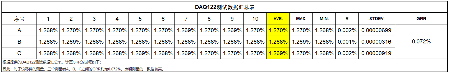 Para garantizar que la tarjeta de adquisición de datos seleccionada cumpla con los requisitos, el equipo de ME la probó. El análisis muestra que la tarjeta de adquisición de datos seleccionada tiene una excelente estabilidad, con un GRR de aproximadamente 0,072% entre tres medidores A, B y C.