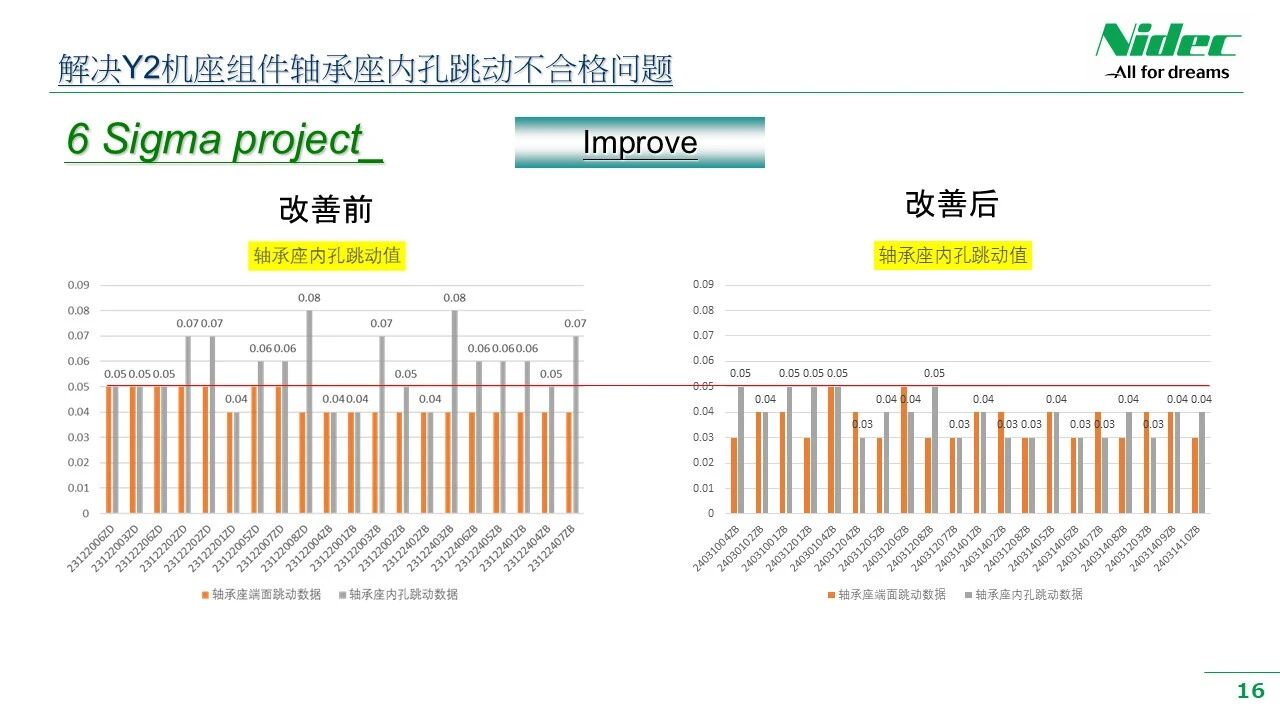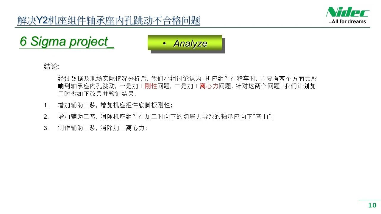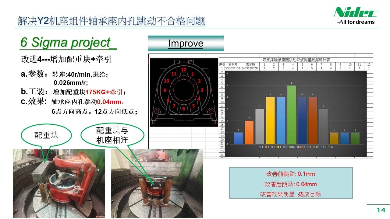 Siguiendo la política de calidad y la filosofía de gestión de la empresa de "Satisfacerse a uno mismo, satisfacer a los clientes, ser honesto y digno de confianza y esforzarse por alcanzar la excelencia", ofrecemos continuamente a los clientes productos de mayor rentabilidad y calidad más estable. Recientemente, en el taller de mecanizado, ha habido un fenómeno en el que las dimensiones clave o las tolerancias geométricas de algunos procesos clave son inestables después del procesamiento y no cumplen con los requisitos de control 6 - Sigma. La dirección de la empresa concede gran importancia a esto y ha promovido el taller para crear un grupo de trabajo para la mejora de la calidad del taller. Este grupo de trabajo está formado por líderes de departamentos relevantes, ingenieros relevantes, líderes de equipo y empleados de producción de primera línea. Utilizando el método DMAIC de mejora 6 - Sigma, se ha lanzado una campaña integral de mejora de la calidad. A través de una serie de actividades de mejora, como investigación de antecedentes, recopilación de datos, resumen de problemas, análisis de causas y formulación de medidas de mejora a corto y largo plazo, el trabajo de mejora de la calidad se ha llevado a cabo en su totalidad. Esta actividad de mejora ha mejorado de manera integral la capacidad práctica de los gerentes y empleados de base para comprender, aplicar y promover las herramientas de mejora 6 - Sigma de manera paralela. Ayuda a reducir la variación y fluctuación de las características de calidad de las piezas mecanizadas, mejorando así la calidad general de fabricación de los motores y ayudando a ofrecer a los clientes productos de mejor calidad.