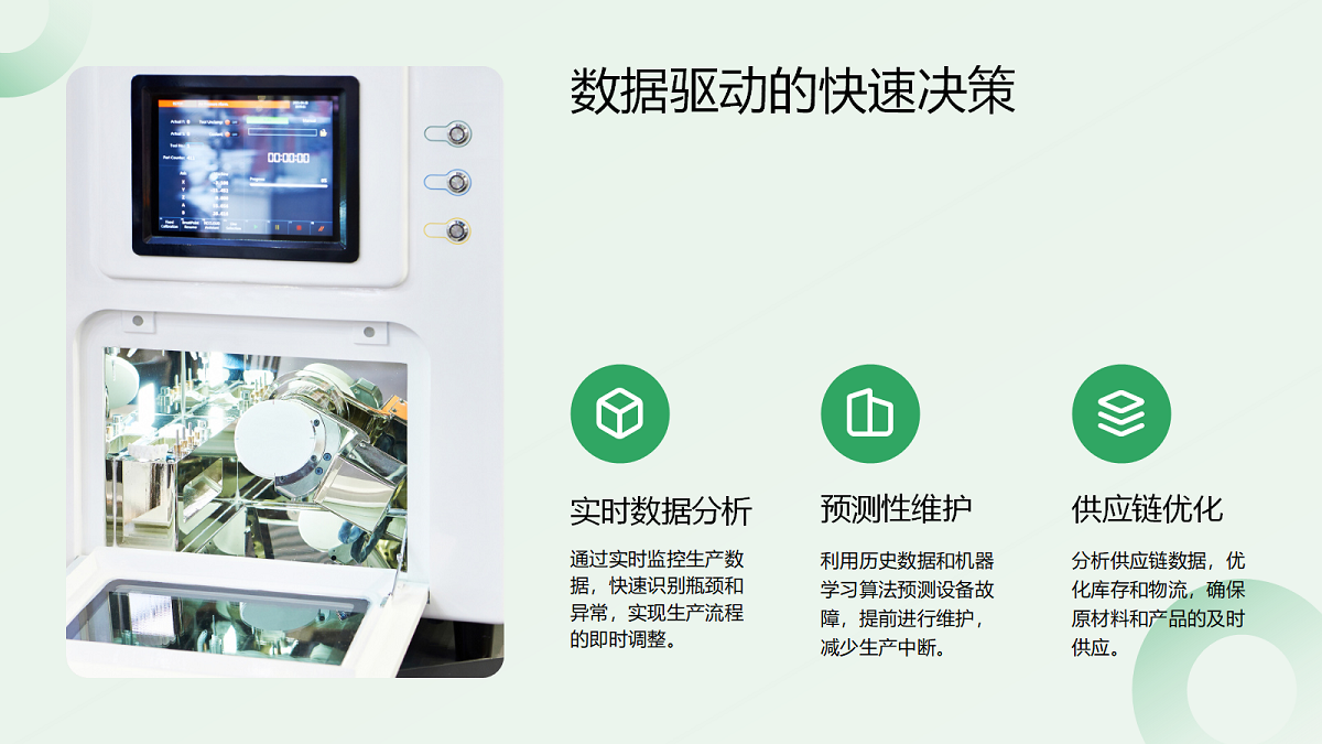 • Toma de decisiones rápida basada en datos: tome decisiones de respuesta rápida mediante análisis de datos en tiempo real, mantenimiento predictivo y optimización de la cadena de suministro.