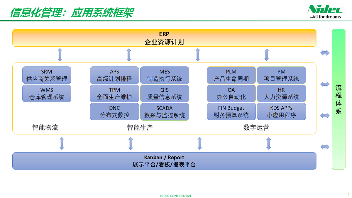 Nidec Elevator Motors ha desarrollado de forma independiente sistemas como SRM (Gestión de relaciones con proveedores), MES (Sistema de ejecución de fabricación), APS (Planificación y programación avanzada), WMS (Sistema de gestión de almacenes) y TPM (Mantenimiento productivo total). Construye todo el sistema de producción inteligente a través de la automatización, digitalización, modelado, visualización, integración e inteligencia, permitiendo la realización de una programación de producción equilibrada y una fabricación inteligente flexible, y sentando una base sólida para la futura realización de una "fábrica faro".