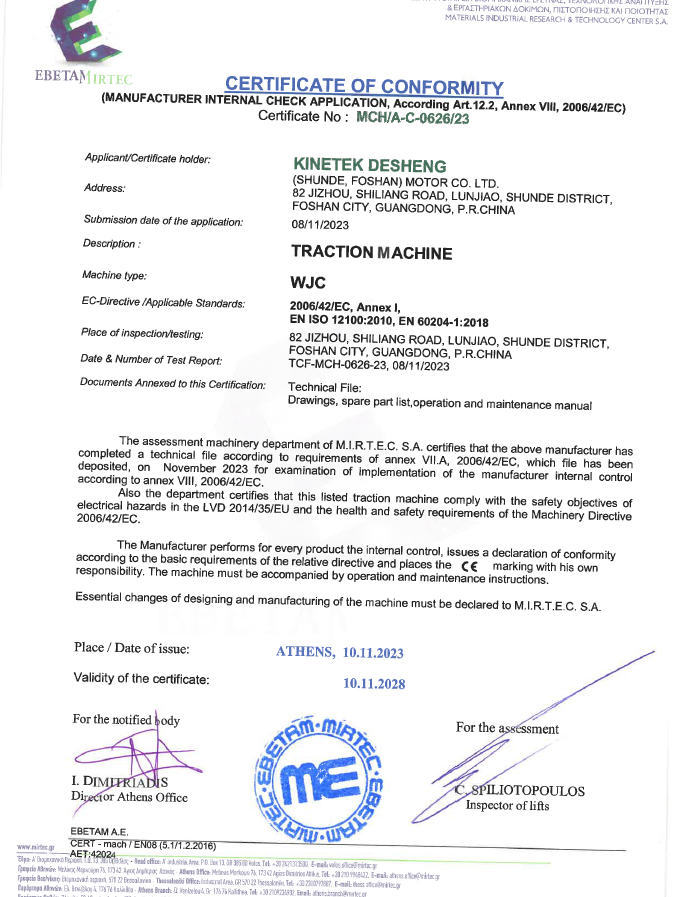 4. Certificación de la UE CE (Certificación CE para la Directiva Mecánica de Motores y Certificación EN81 para los frenos): cubriendo todas las series de nuestros modelos como WJC/WTY1/WR/WTY2.